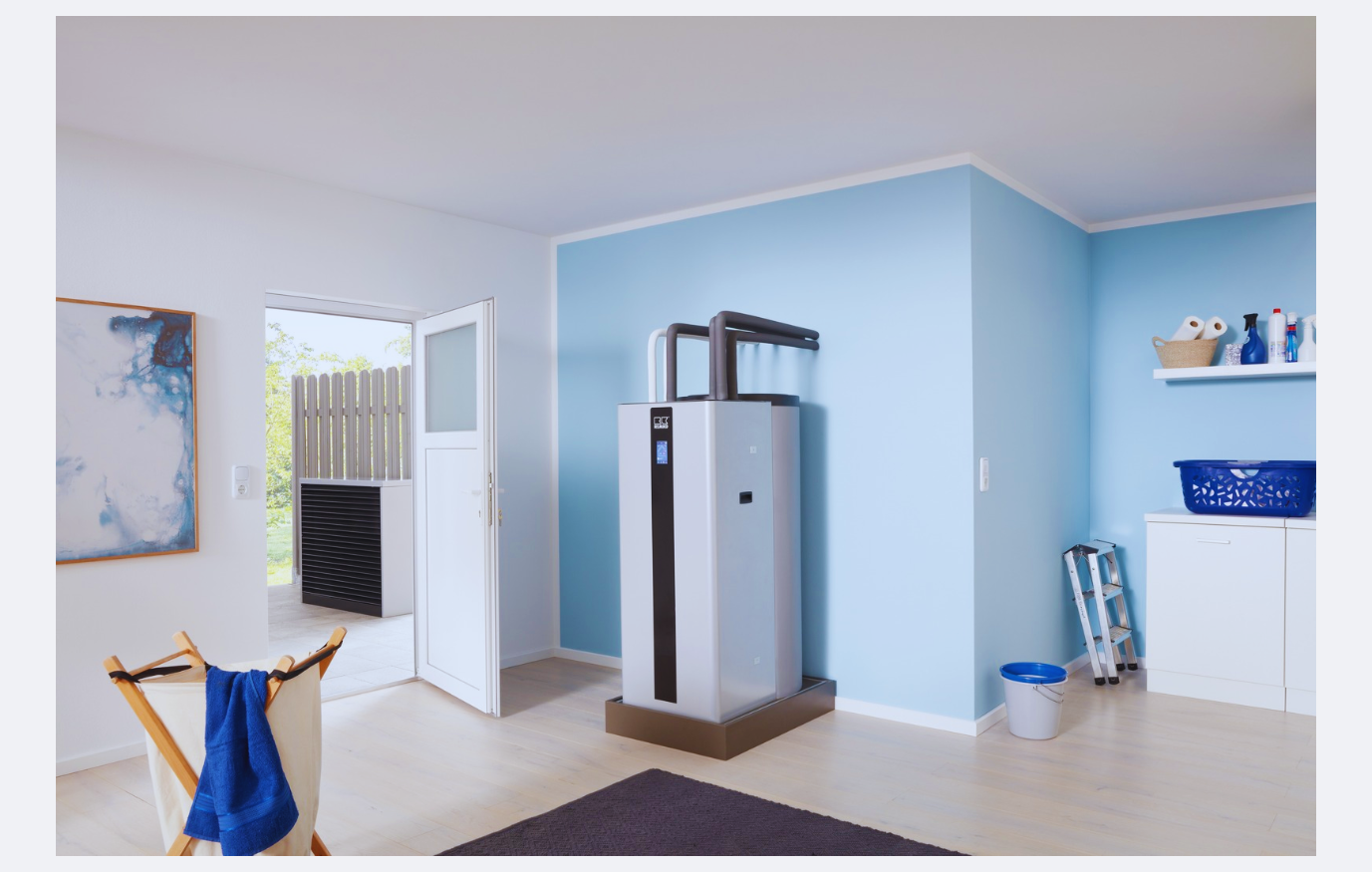 Melegvizes hőszivattyú beépített szellőztetőegységgel a lakótér szellőztetéséhez