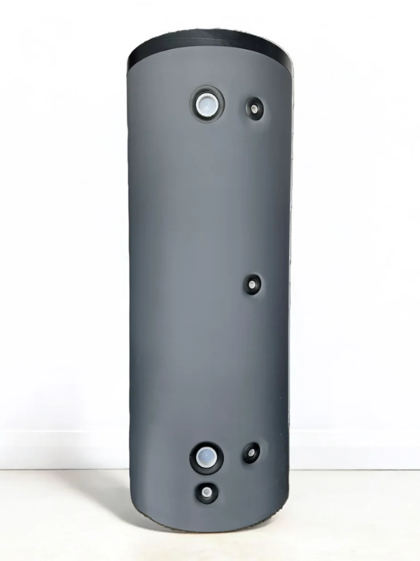 A puffertartály csatlakozásai 1 1/2"-os belső menettel rendelkeznek, amely lehetővé teszi a szabványos elektromos fűtőelemek becsavarozását kiegészítő vagy vészfűtésként.